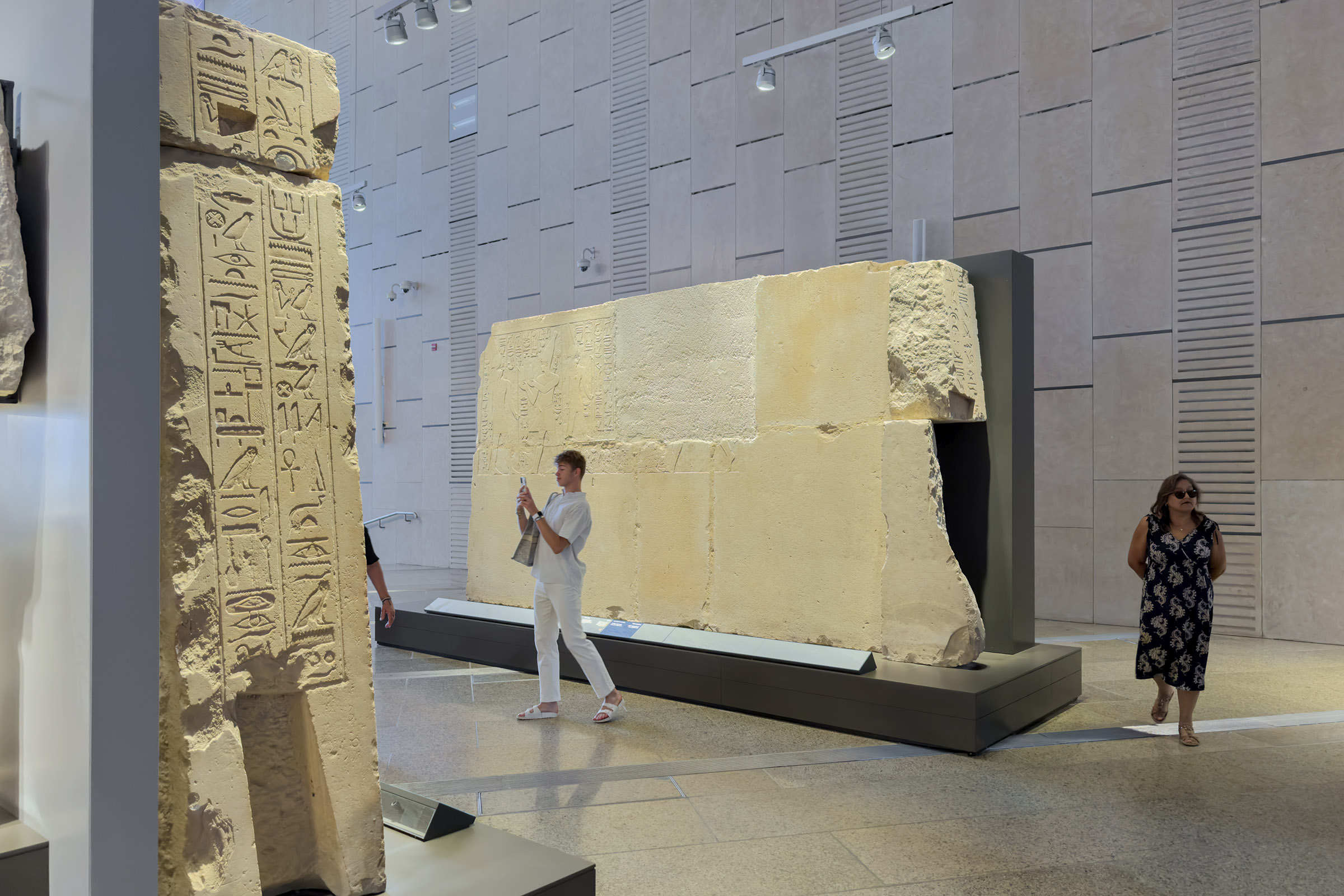 The approach to the museum is a series of layers, whereby the visitor moves through a monumental forecourt, a shaded entrance area and a grand staircase that ascends to plateau level, the level at which the galleries are located where for the first time the visitor sees the pyramids from within the museum.