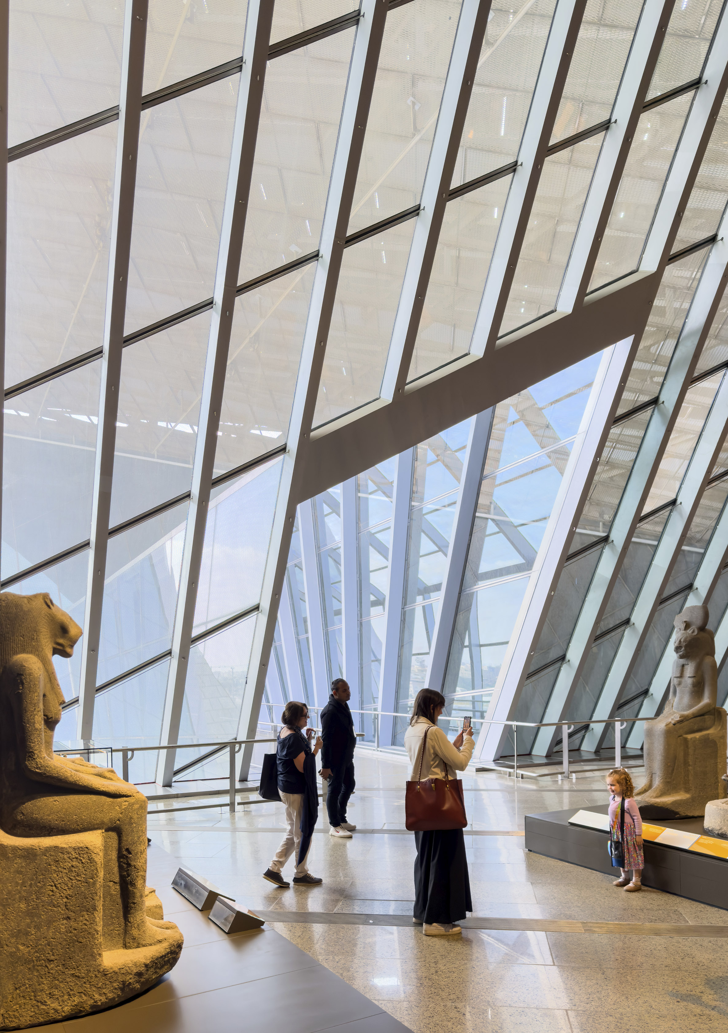 The Grand Staircase ascends from the Entrance Court to the permanent exhibition galleries on the top floor stopping off at special exhibitions, temporary exhibition, and Archaeological Main Storage. The staircase is the chronological route within the museum, culminating in the view of the pyramids at the top of the stair. An identifiable reference point, the Grand Staircase allows visitors to easily navigate this vast Museum.