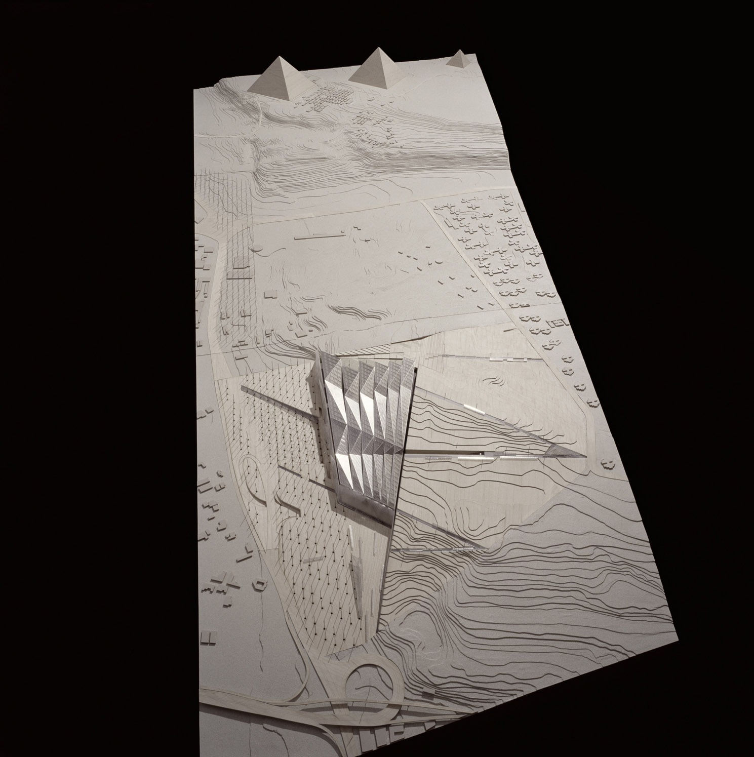 A 3-dimensional structure inscribed by a set of visual axes from the site to the three pyramids defines the framework within which the museum emerges, from the overall scale of the site to the smallest of details.The design of the museum utilises the level difference between the Nile Valley and the desert plateau to construct a new ‘edge’ to the plateau. The museum exists between the level of the Nile Valley and the plateau, never extending above the plateau.