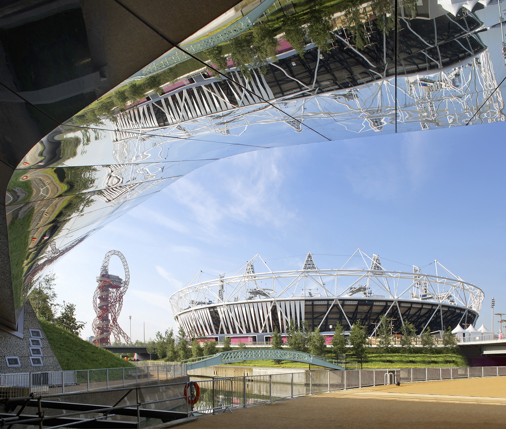 During the Olympics a central temporary infill between the bridges accommodates the crowds. In the legacy park, two bowls are created on either side of the lock linking the upper park concourse with the lower level of towpaths and waterways.