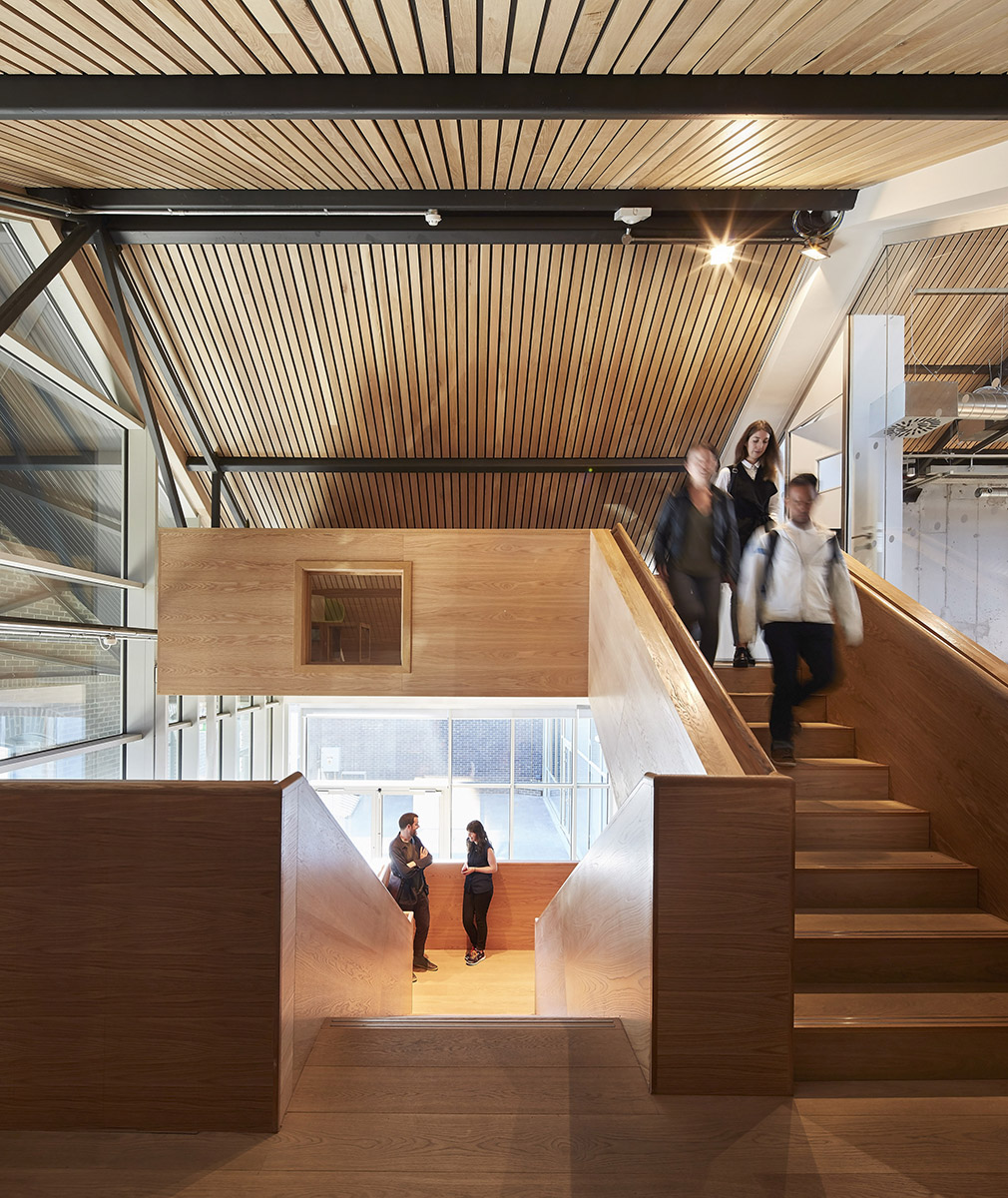 To make one workspace where people can freely move between the 3 floors, the rooflit atrium at the centre of the building is reimagined as a staircase. Full-width slow stairs lead from the ground to the lower ground creating an amphitheatre for “all-hands events” and a meeting space for day to day use. Wrapping across the atrium, a light stair leads from the ground to the first with balcony mid-flight looking back over the space. The walkways around the atrium become balconies, an informal theatre as the soul of the space. A new stairway at the entrance is conceived of as a series of small lounges that lift up to provide view back to the canal basin and the city.