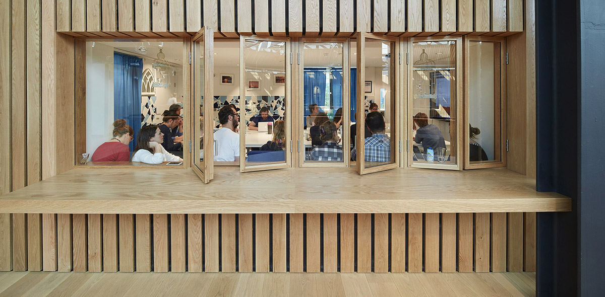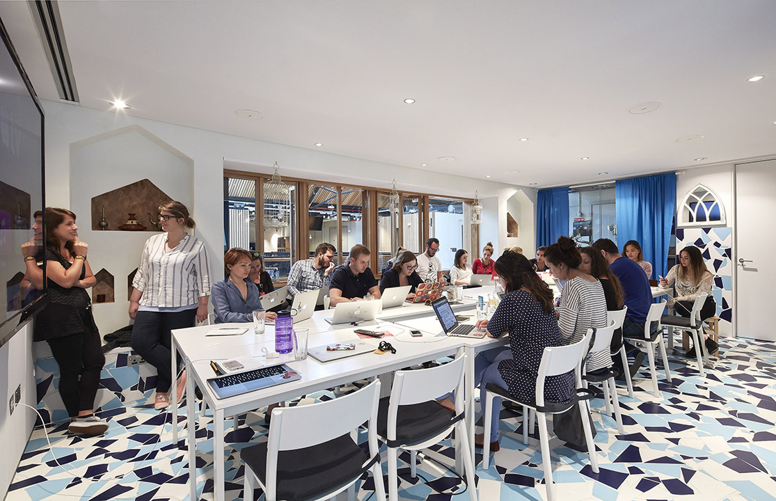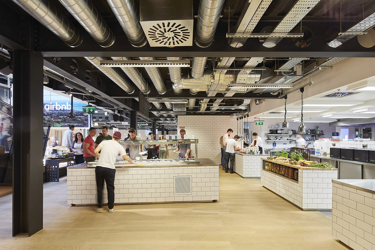 Food as a place of gathering and hospitality is central to Airbnb. The lower ground floor level houses an open kitchen and dining space, providing breakfast and lunch. Kitchenettes are also located at the entrance to each floor level, creating a social space that links back to the central All Hands space.