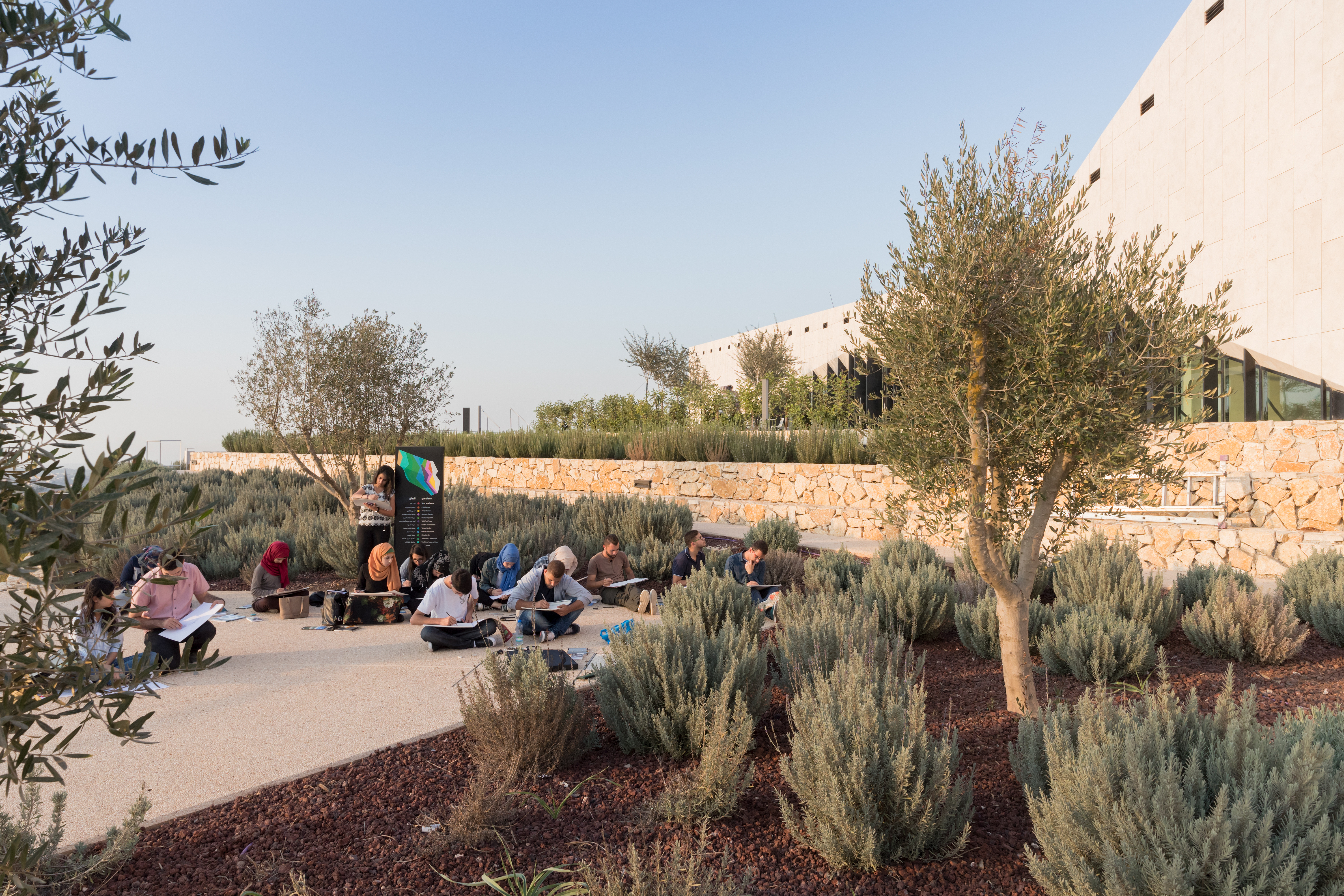 The theme of the landscape; from the cultural to the native, unfolds across the terraces with the more domesticated terraces close to the building and changing as one moves down to the west. Groves of olives, pomegranate, fig, apricot, almond, carob and walnut are already yielding fruit and nuts, below them a thick, aromatic carpet of wheat, chickpea, mint, za’atar, sage, chamomile, jasmine and lavender bloom. The plants are both indigenous to Palestine or have become synonymous with Palestine as results of its position along ancient trading routes.